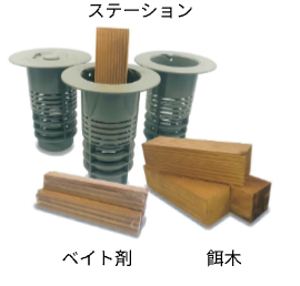 シロアリの習性を利用したベイト剤システムで、女王アリまでしっかり駆除。ステーションと呼ばれる容器に、シロアリが大好きな木材と特殊なベイト材をセット。地中に埋めるだけで、あとはシロアリたちが勝手に「毒入りのごちそう」を巣に運んでくれるんです。