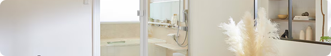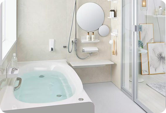 ゆったりできるバスタブ、さっと浴びられるシャワーを兼ね備えたタイプ。収納もカウンターもお好みにアレンジして使えるフレキシブルなバスルームです。マグネットアイテムで、より一層コーディネートは広がります。